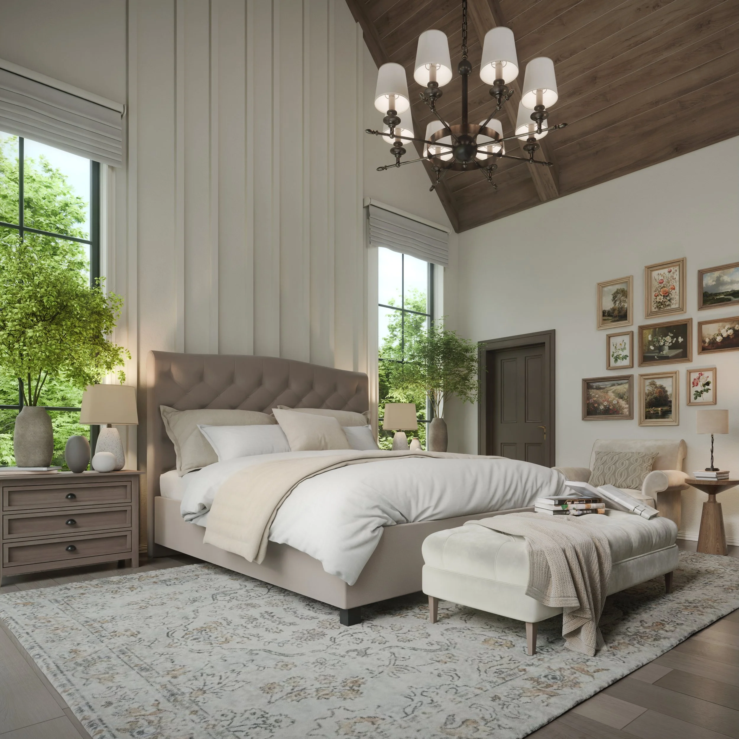 A plush, tufted headboard anchors the bed, flanked by classic nightstands and matching table lamps. Soft, neutral tones in the bedding, bench, and armchair create a soothing palette, while large windows frame vibrant greenery, filling the room with natural light. The ornate area rug beneath ties the room together, offering depth and texture.